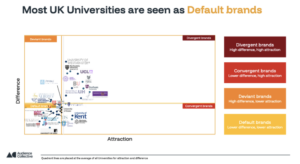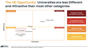 Our Brand Divergence Index (BDI), which measures a brand’s levels of Difference and Attraction, shows universities have some of the lowest scores of any category we have analysed.